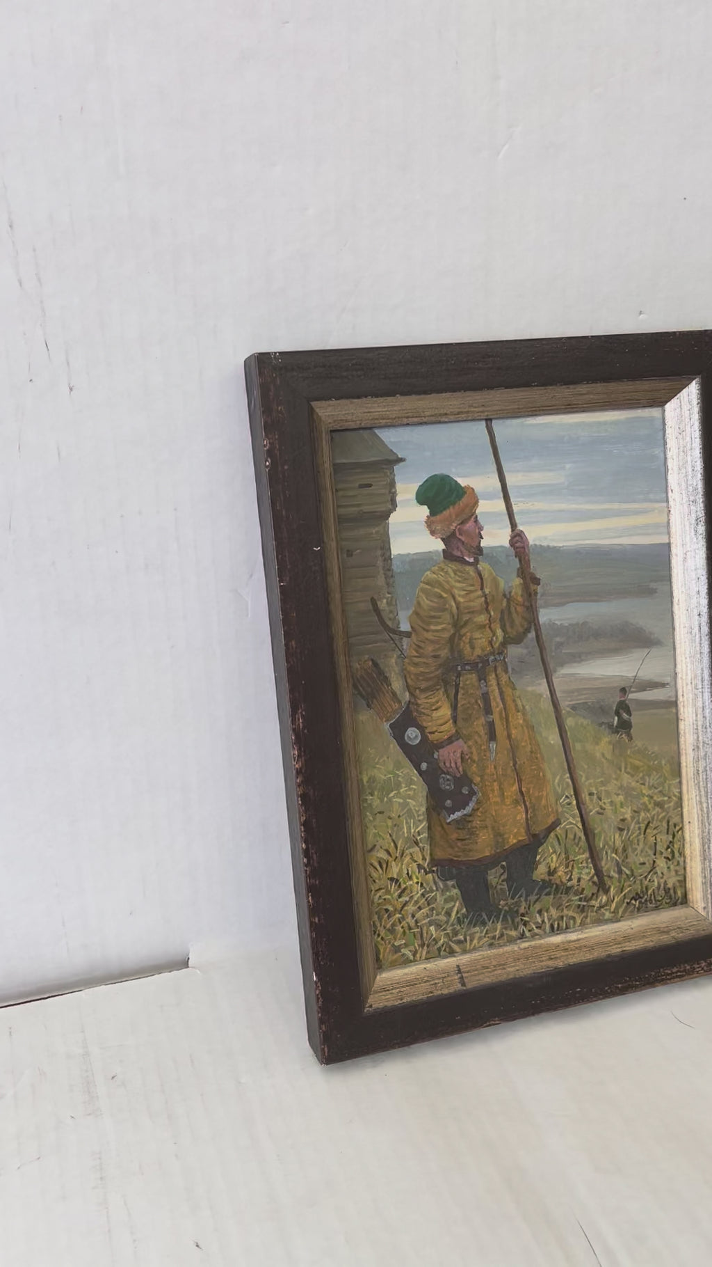 This pair of vintage paintings depicts a Tatar guard and a Tatar woman, each dressed in traditional attire, rendered with fine attention to detail and historic character. The works are executed in what is likely oil on board and presented in rustic wooden frames with natural wear consistent with age.