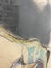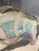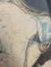 Large-scale vintage mixed media artwork on paper depicting an abstracted, kneeling human form rendered in expressive graphite and colored pastel lines. The figure features dynamic contour drawing, bold black shading, and areas of vibrant color in blue, green, yellow, and magenta. A separate organic form, shaded in monochrome tones, is positioned near the lower center of the composition. The background incorporates sprayed black pigment, creating contrast and depth.