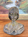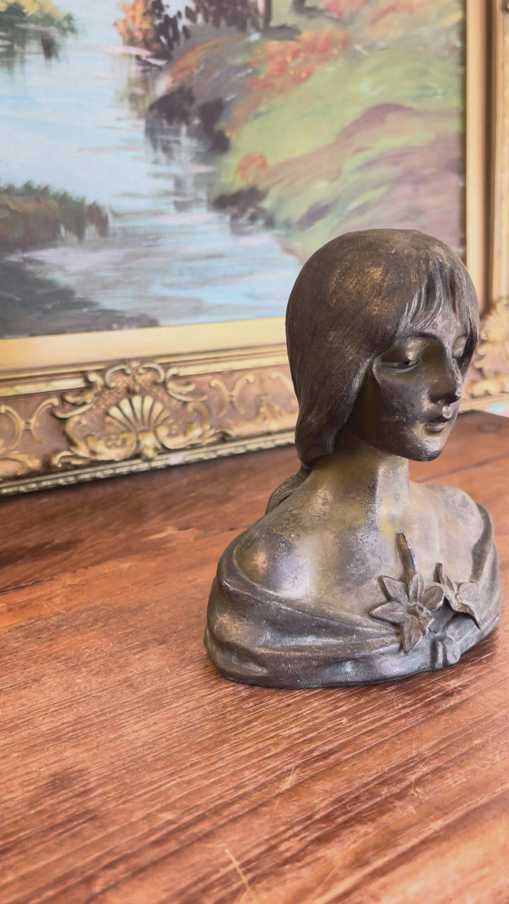 An early 20th-century Art Nouveau cast metal bust depicting a serene young woman, her hair softly framing her face. The figure is draped in a stylized shawl adorned with a pair of lilies at the neckline, a motif characteristic of the Art Nouveau era's organic forms and floral symbolism.The sculpture features a warm bronze-toned patina with areas of age-related wear, lending it a timeworn charm.