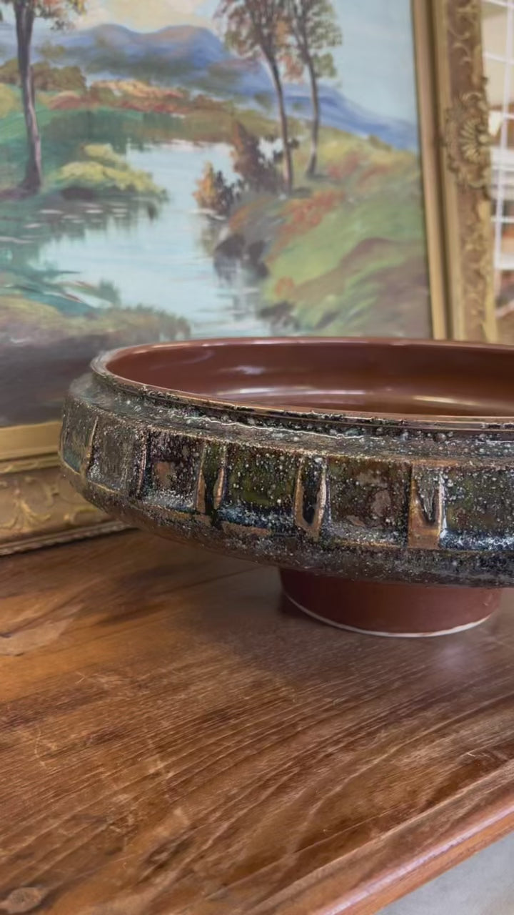 Mid-Century Modern Glazed Studio Pottery Pedestal Bowl with Textured Lava Exterior