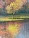 This is an original oil painting on board titled Autumn Dress by artist A.B. Mosman, dated 1978. The work captures a serene autumn landscape with richly textured foliage rendered in warm tones of gold, amber, and crimson. The composition is reflected in a still body of water, emphasizing the painter's attention to light and seasonal atmosphere.