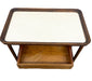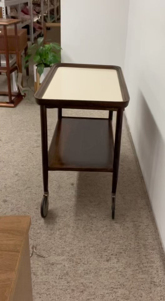 This vintage mid-century modern rolling bar cart combines practicality with timeless design. Crafted with a warm wood frame, it features a rectangular top inset with a white textured surface, framed by raised wooden edges for both style and function.The cart is supported by four sturdy legs, each mounted on smooth-gliding metal caster wheels for easy mobility.