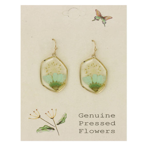 Low stockBring home cottage style with genuine pressed flower jewelry! These delicate geometric shape earrings feature dried flowers set in clear acrylic wi...