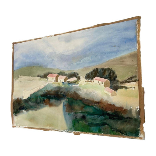 Low stockNature Landscape of Houses by Stream . Primary Colors are Green and Blue. Unsigned. Appears to Have Previously Been Framed due to Conditioning Ar...