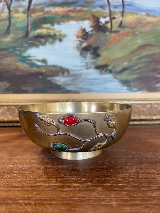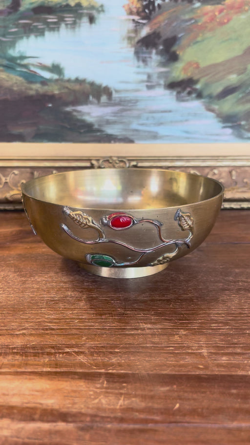 Chinese Brass Toned Bowl with Applied Gemstone Accents and Floral Motif