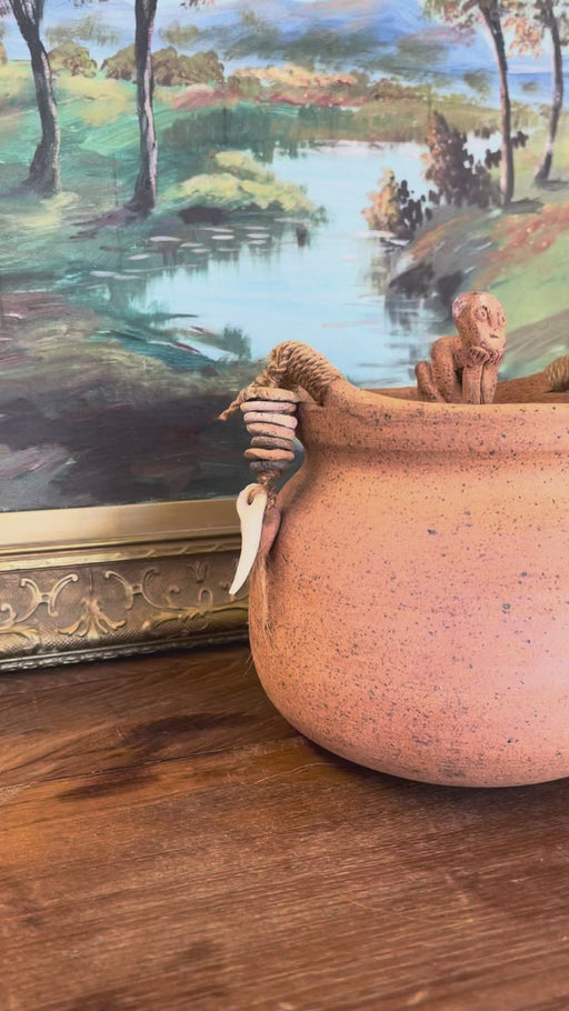 Handmade Indonesian Terracotta Lidded Jar with Beaded Raffia Accents and Seated Figure Finial