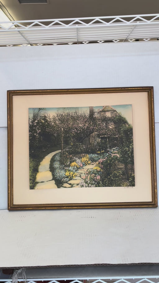 Low stockThis hand-colored photograph or possibly lithograph by Wallace Nutting (1861-1941) depicts a charming garden walkway leading to a stone cottage, su...
