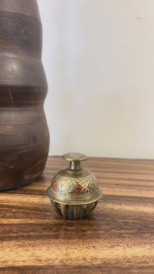Antique Indian Brass Claw Foot Bell with Hand-Painted Floral Enamel, Early 20th Century