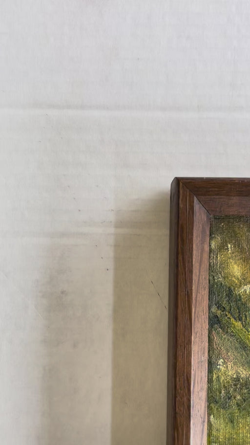 Low stockThis vintage oil painting by Evelyn Childress captures a rustic autumn landscape with a wooden wagon resting in a grassy field. The scene features ...