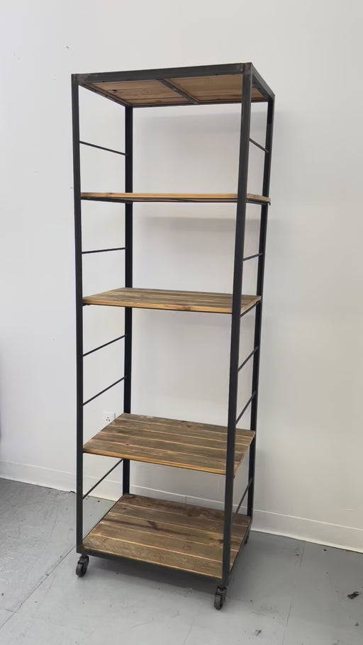 Low stockNewly crafted tall shelving unit with a sleek black metal frame and wood shelves. The design combines clean, industrial lines with warm, rustic pla...