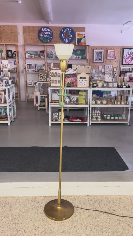 Mid-Century Modern Brass Toned Torchiere Floor Lamp with Sculptural Patinated Metal Accent and Ribbed Glass Diffuser