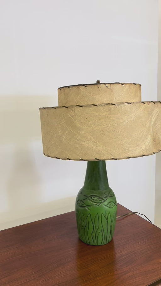 Low stockMid-century ceramic-like material table lamp featuring a vivid green base with hand-carved fish and aquatic plant motifs. The lamp retains its orig...