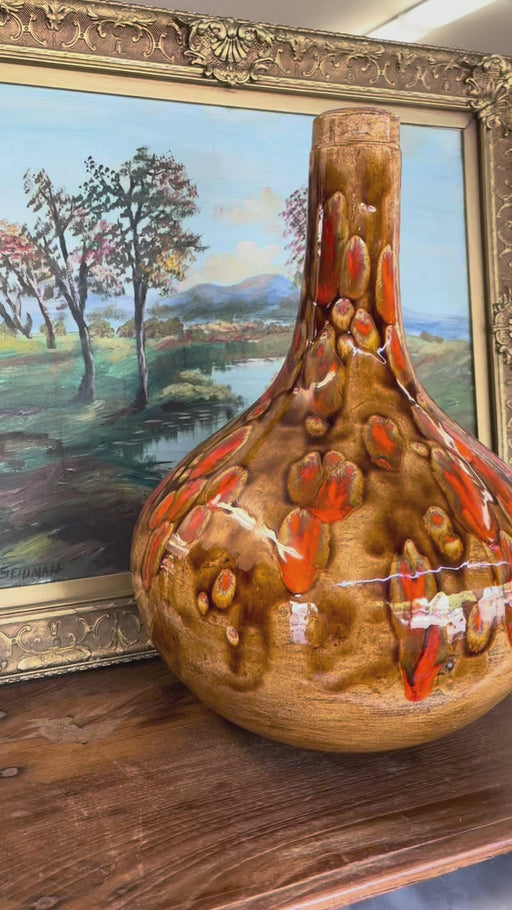 Large Mid-Century Modern Drip Glaze Pottery Vase in Brown and Lava Orange Tones
