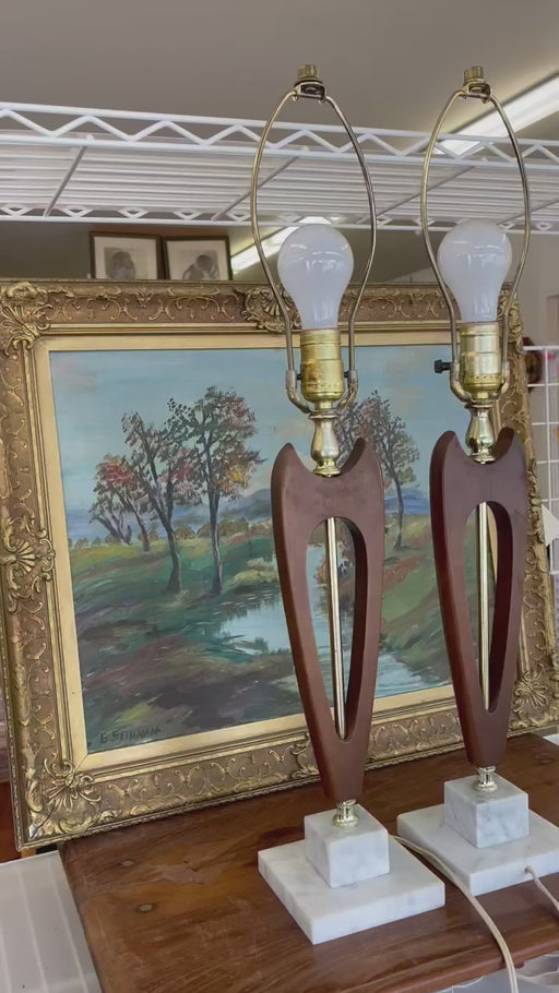 Pair of Mid-Century Modern Sculptural Likely Walnut and Brass Toned Table Lamps with Possibly Carrara Marble Bases