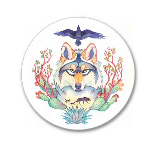 In stockDescription : A 3" round vinyl sticker featuring a Mexican gray wolf, raven, and native southwestern plants including manzanita, prickly p...