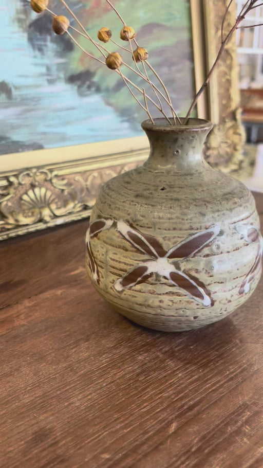 Low stockThis vintage studio pottery bud vase features a compact, globular form with a narrow neck and flared rim, showcasing a beautifully earthy glaze in ...