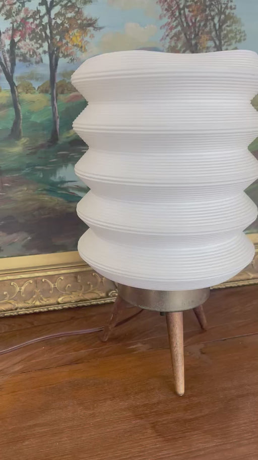 Original price $595.00 - Original price $595.00Original price$595.00$595.00 - $595.00Current price $595.00| /Mid-Century Modern Space-Age White Ribbed Lantern Table Lamp on Wood Tripod Base, Possibly 1960s Scandinavian DesignLow stockIn style of Angelo Lelli, mid-century sculptural table lamp possibly from the 1950s, featuring a wooden tripod body, possibly walnut. The sculptura... View full detailsOriginal price $595.00 - Original price $595.00Original price$595.00$595.00 - $595.00Current price $595.00| /