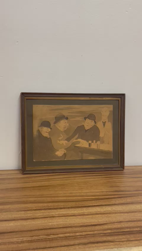 Vintage Framed and Signed Original Artwork of Men Sitting at a Table