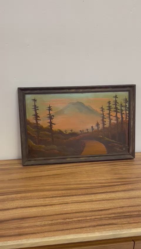 Low stockPossibly 1930s, due to Age of Frame and Petina on Painting. Possibly Oil or Acrylic on Canvas. Mountain Forest Scene. Vintage Condition Consistent ...