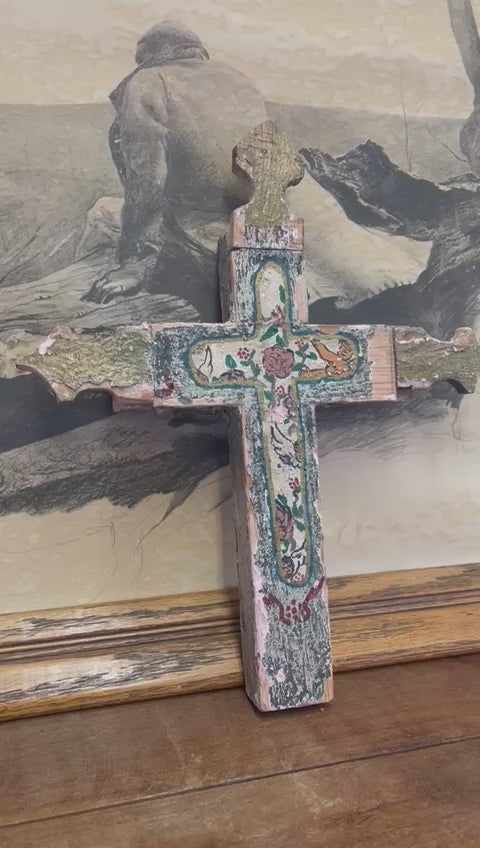 Low stockCross with Beautiful Aging and Petina to the Paint and Wood. Floral and Angel Motifs. Pink and Green Toned Color,with Gold Tones at the Tip of the ...