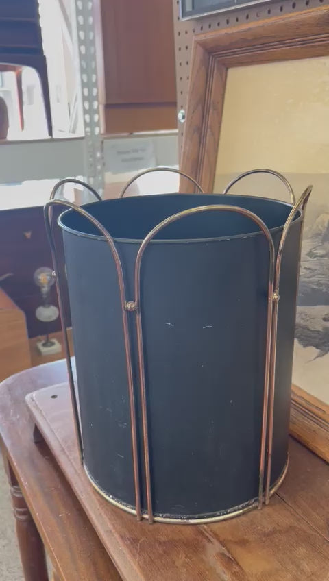 Original price $79.00 - Original price $79.00Original price$79.00$79.00 - $79.00Current price $79.00| /Vintage Black Trash Bin With Gold Toned AccentsLow stockPetite Waste Bin with Rounded Gold Accents . Vintage Condition Consistent with Age as Pictured.Dimensions. 11 Diameter ; 13.5 H Original price $79.00 - Original price $79.00Original price$79.00$79.00 - $79.00Current price $79.00| /
