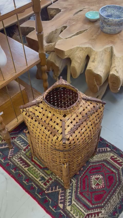 Original price $375.00 - Original price $375.00Original price$375.00$375.00 - $375.00Current price $375.00| /Vintage Rattan Woven BasketLow stockRustic Basket with Intricate Detailing. Possibly Bamboo Legs. Wear and Tear Consistent with age as Pictured.Dimensions. 12 W ; 12 D ; 21 H Original price $375.00 - Original price $375.00Original price$375.00$375.00 - $375.00Current price $375.00| /