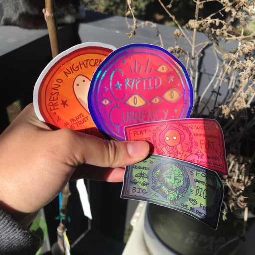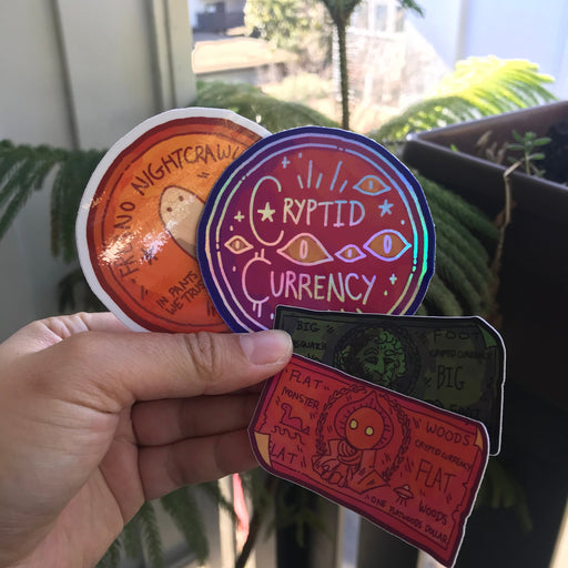In stockDescription : Each sticker is approximately 3 inches (7.6 cm) on the longest side. Cryptid Currency - holographic Cryptid Currency sticke...