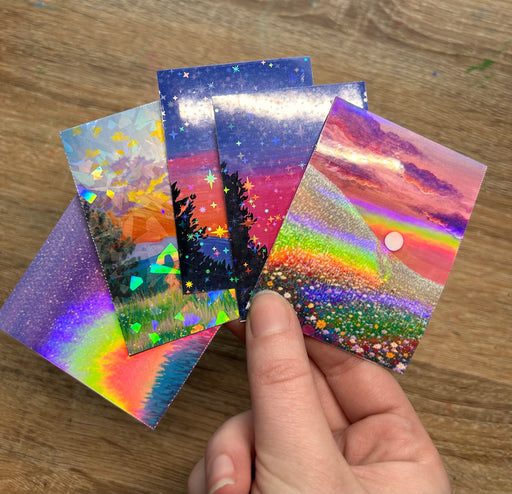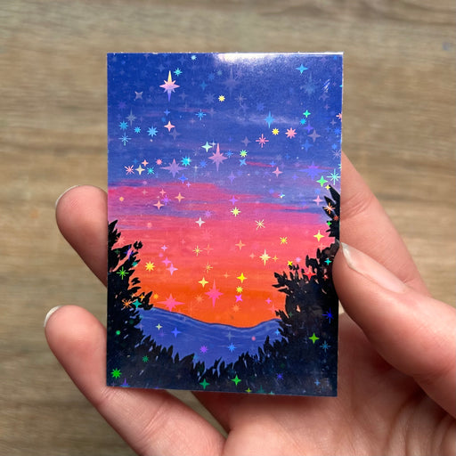 In stockDescription : A 2"x3" holographic sticker depicting a sunset. Stickers are water resistant and made by hand. Square sticker is 2.5"x2.5"...