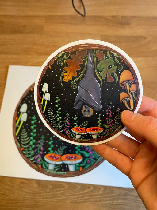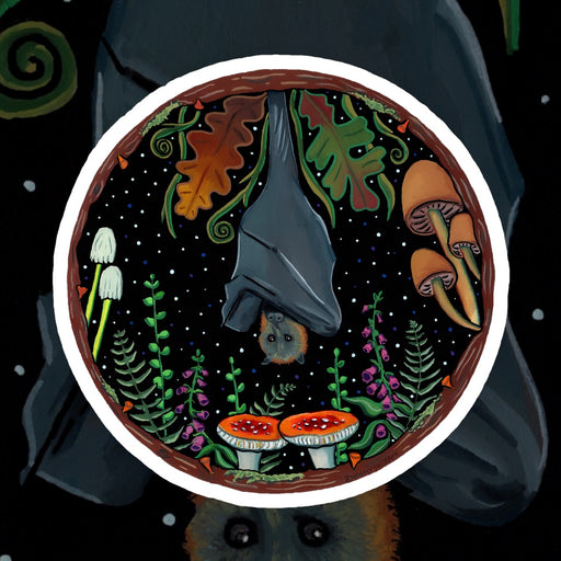 Spooky Botanical Mushroom Bat Waterproof Sticker, Woodland
