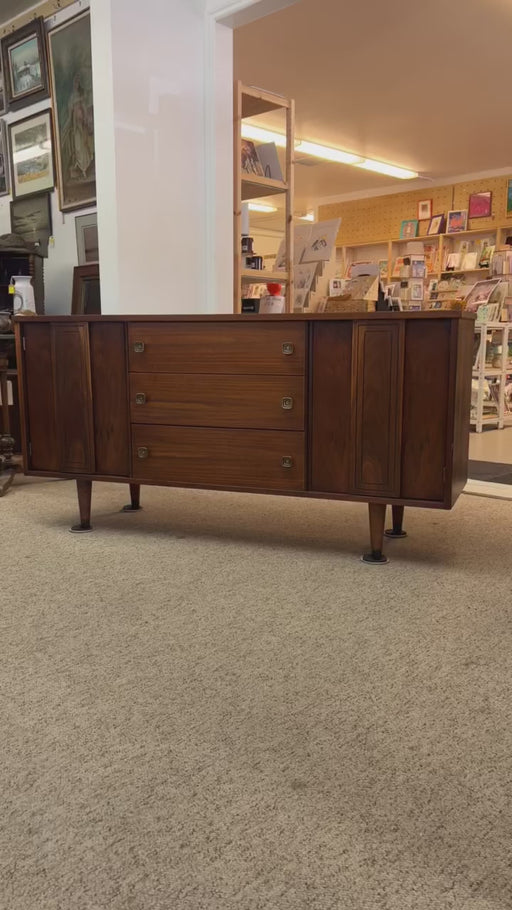 Vintage Mid Century Modern Walnut Wood Credenza Buffet 3 Drawers with Milled Metallic Knobs
