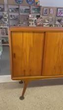This Cabinet features sliding doors and a Cabinet Space with an adjustable shelf. Tapered Legs and wood carved Handles, Classic Danish Modern desig...