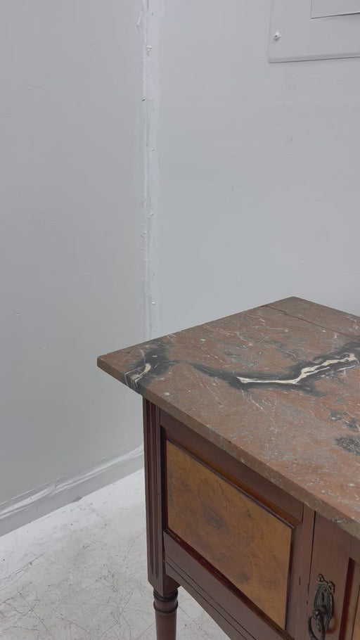 English buffet with marble top and 2 doors. The handles and escutcheons are bronze. It rests on four tapered legs that ends in casters.Dimensions. ...