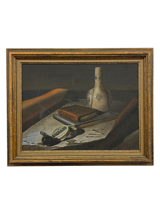 Vintage Still Life Painting with Bottle, Book, Pipe - Signed by Cannon