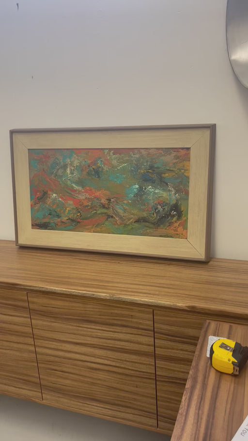 Low stockVibrant mid-century abstract expressionist painting signed Margaret Smith. This original work features a dynamic palette of teal, orange, ochre, ...