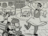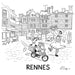 Description : Emile and his dog, Bernard, speed through historic Place St. Anne in the city of Rennes on a bicycle adventure through France in this 10x10-inch black and white print illustration on card stock paper from the “Détours de France” series.