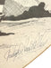 The artwork is signed in the lower right corner.While the piece appears to be hand-drawn, the medium (original drawing vs. printed reproduction) cannot be confirmed without further examination.Presented in an oval-cut mat against a dark background, the artwork is framed behind glass in a simple metal frame.The frame and matting have a vintage appearance, likely dating from the late 20th century. The piece is ready to hang.