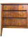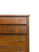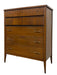 The tall chest features five drawers-two smaller top drawers adorned with the signature carved star pattern, and three full-width lower drawers fitted with classic brass-toned pulls with wooden centers.Drawers operate smoothly and offer generous storage.The case stands on tapered legs for an elevated MCM profile. Original "Saga by Broyhill Premier" label remains intact.