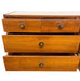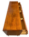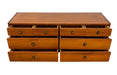 The dresser is constructed with solid wood drawer boxes, visible dovetail joinery, and smooth-operating drawers. The case showcases warm tone variation and natural grain patterning across the drawer fronts, top surface, and side panels.The original round pulls consist of a two-tone circular design, adding a subtle sculptural accent to the otherwise streamlined profile.