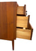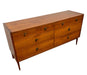 Raised on tapered legs, the dresser maintains a balanced and elevated stance typical of Mid-century American furniture. The proportions allow it to function equally well as a bedroom dresser, dining sideboard, or living room storage cabinet.