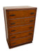 The dresser is built on a recessed plinth-style base with gently curved feet, typical of the period. The back panel is marked “1210-Wal. Chest", consistent with mid-century production coding. The interior of some drawers shows worn paper lining,with portions missing (as shown), but the structural integrity of the drawers remains solid.This highboy offers generous storage and a handsome profile, making it suitable for a bedroom, entryway, or any space needing a functional, well-crafted vintage piece.