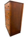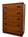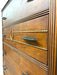 A notable decorative element is the carved laurel wreath motif centered on the second drawer, framed by small beaded trim that adds a subtle neoclassical accent. Linear routed detailing appears across multiple drawer faces and along the case edges,giving the dresser a sense of symmetry and visual structure.The original metal pulls-dark-toned with a stylized engraved pattern-remain intact on all drawers.