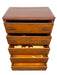This vintage mid-century highboy dresser, attributed to John Stuart (label present inside drawer), offers a refined blend of streamlined form and decorative detailing characteristic of mid-century American furniture design. The piece features five full-size drawers, each constructed with sturdy joinery and smooth operation. The warm tone highlights the natural grain variation across the drawer fronts and case.