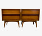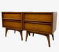 The matching pair of nightstands mirrors the design language of the dressers, each featuring two spacious drawers with sculpted integrated pulls and dovetailed drawer construction. The rectangular cases rest on gently tapered legs, creating a cohesive visual connection across the entire set. Flat tops provide practical surface space for lamps, books, or decorative objects.Together, the four pieces create a well-balanced mid-century bedroom arrangement, suitable for use as a coordinated suite or distributed throughout a space while maintaining a unified aesthetic.