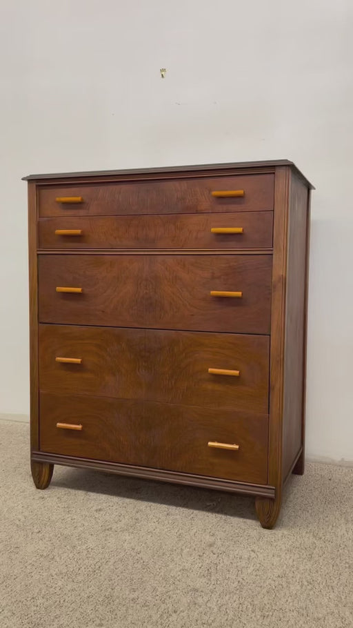 Vintage Art Deco 5 Drawer Dresser with Book matched Burl Wood Accents and Bakelite Pulls by Crescent furniture Co