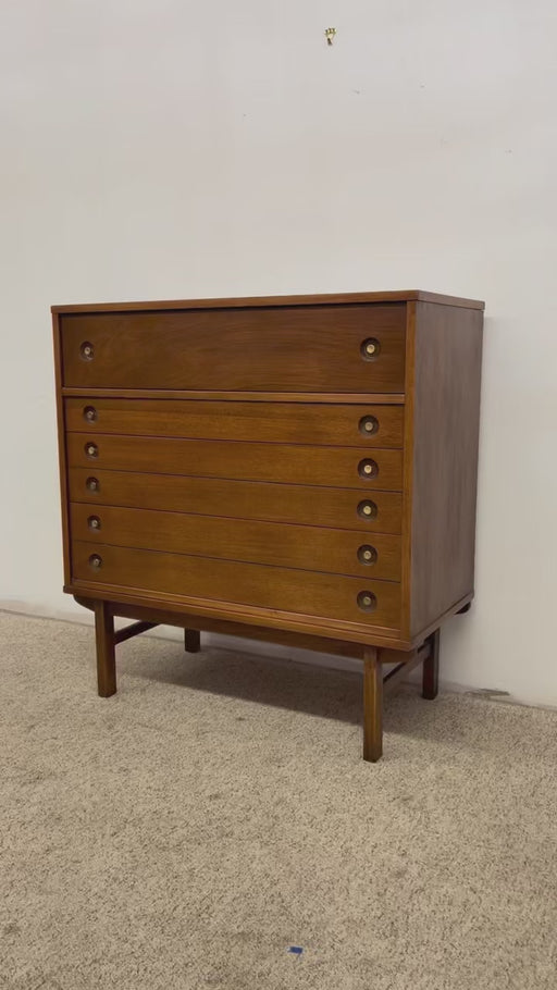 Low stockA vintage mid-century modern tallboy dresser featuring bold sculptural drawer fronts and clean, geometric lines. The upper drawer is accented with ...