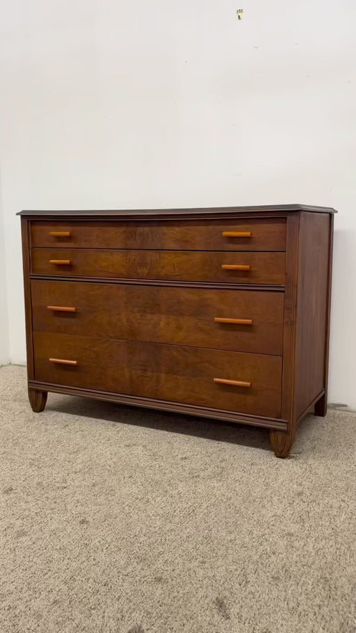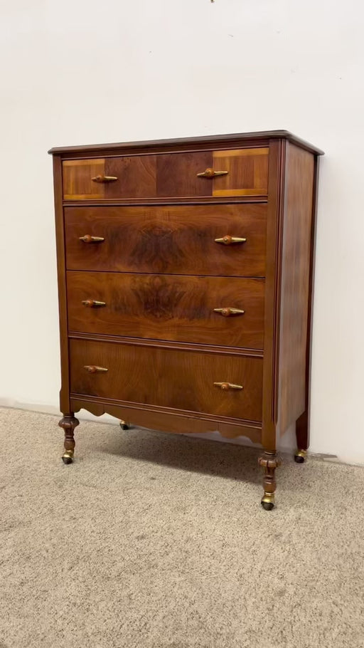 Vintage Art Deco 4 Drawer Dresser with Book matched Burl Wood Accents and Bakelite Pulls by Crescent furniture Co