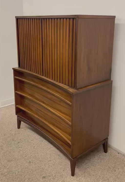 Low stockA striking mid-century modern highboy dresser featuring sculpted drawer fronts. The upper cabinet showcases two doors that open to reveal two spaci...