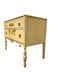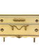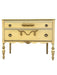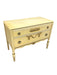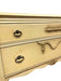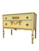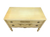 Elegant and full of charm,this French Provincial style dresser features a soft cream-painted finish with delicate distressing that highlights its age and character. The piece includes two spacious drawers with decorative front panels, adorned with ornate pulls and a central carved applique for added refinement.