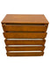 The dresser stands on tapered legs typical of mid-century design. The drawer faces display attractive wood grain patterns, adding texture and natural variation to the overall presentation. Drawers open close smoothly and provide generous interior storage.