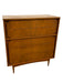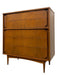 A well-crafted Mid-Century Modern highboy dresser featuring clean lines, warm wood tones, and sculpted drawer fronts that showcase the era's signature blend of form and function. This piece offers five full-width drawers, each designed with integrated recessed pulls and gently contoured edges that add visual depth without interrupting the streamlined silhouette.